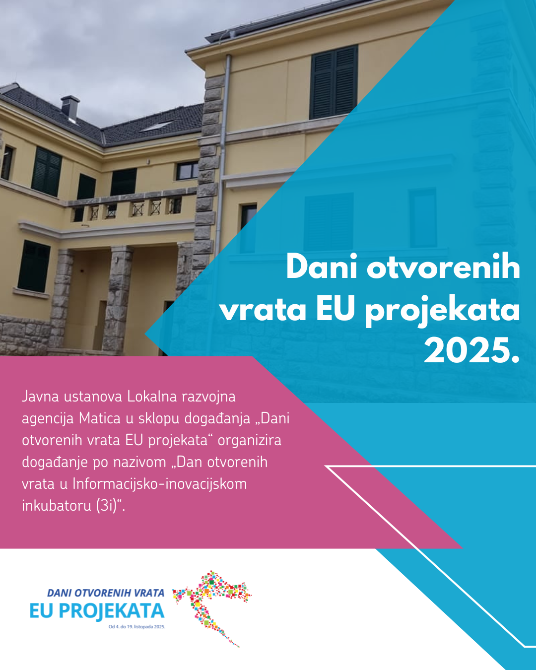 Javna ustanova Lokalna razvojna agencija Matica dana 7.10.2025. godine od 8.00 do 14.00 sati u sklopu događanja „Dani otvorenih vrata EU projekata“ organizira događanje po nazivom „Dan otvorenih vrata u Informacijsko-inovacijskom inkubatoru (3i)“, u sklopu kojega će se zainteresiranoj javnosti predstaviti programi, oprema i infrastruktura kojom 3i inkubator raspolaže, te će se uz isti predstaviti i Javna ustanova Lokalna razvojna agencija Matica kao Poduzetnička potporna institucija. Također, na dan održavanja događanja, povremeni korisnici inkubatora (freelanceri i digitalni nomadi) moći će bez naknade koristiti coworking prostor u sklopu inkubatora, dok će ostali zainteresirani posjetitelji imati mogućnost bez naknade (uz stručno vođenje) isprobati opremu koja se nalazi u inkubatoru.