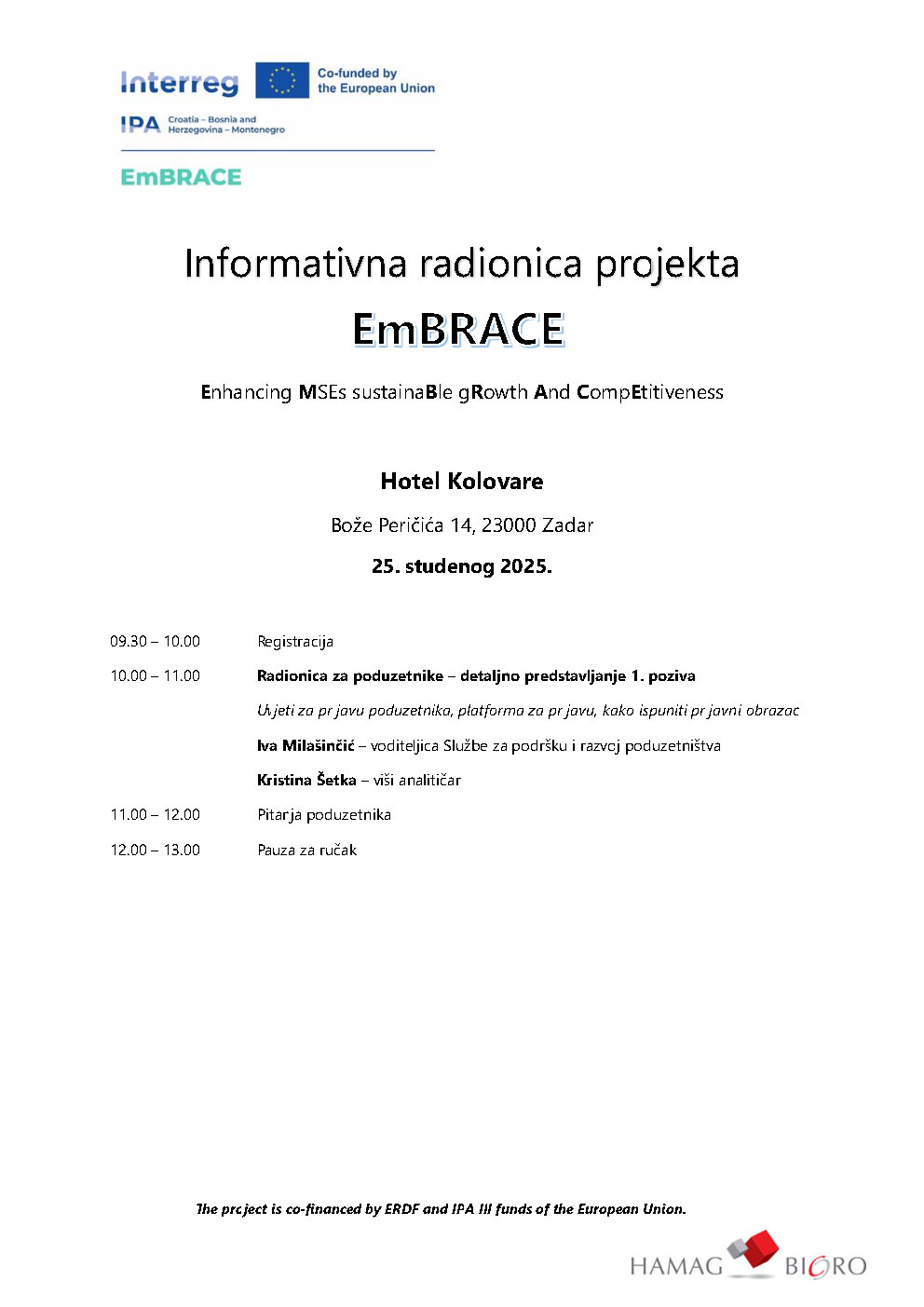 Lokalnim predstavnicima institucija i poduzetnicima projekt EmBRACE i svi detalji vezani uz prijavu biti će predstavljeni na informativnim radionicama za poduzetnike 6. studenog u Sisku, 11. studenog u Vitezu, 17. studenog u Podgorici, 25. studenog u Zadru te 26. studenog u Ljubuškom. Za sudjelovanje na informativnim radionicama vezano uz drugi poziv, prijaviti se možete putem poveznice. Broj mjesta je ograničen, stoga molimo da rezervirate svoje mjesto na vrijeme. Sudjelovanje na radionicama je besplatno.