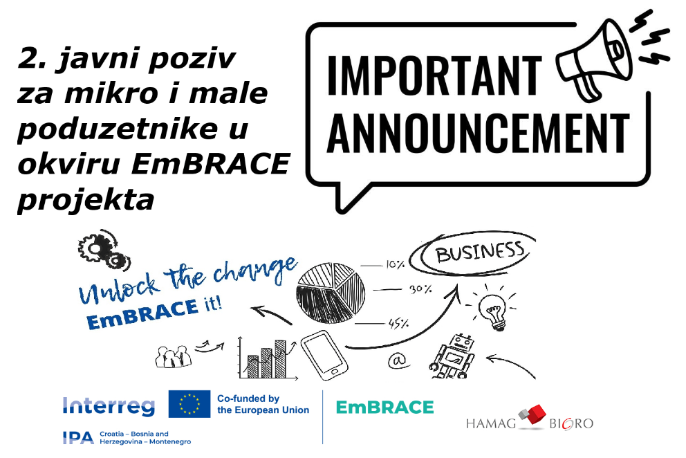 Hrvatska agencija za malo gospodarstvo, inovacije i investicije (HAMAG-BICRO) objavljuje 2. Javni poziv za dostavu projektnih prijedloga mikro i malih poduzeća s pograničnog područja Hrvatske, Bosne i Hercegovine te Crne Gore, u okviru EmBRACE projekta.